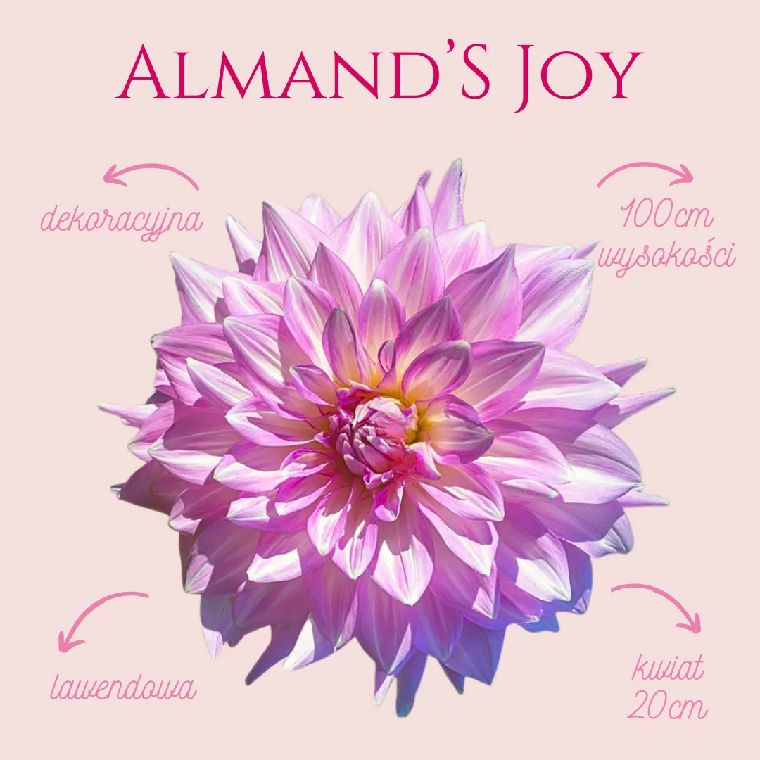 Dalia Almand's Joy to dekoracyjna georgina o wyjątkowo subtelnej, lawendowej kolorystyce. Jej płatki mają chłodny, fioletowy ton, który delikatnie rozjaśnia się ku brzegom, tworząc świetliste, pastelowe refleksy. Kwiat jest pełny — idealny do eleganckich kompozycji w chłodnej palecie.