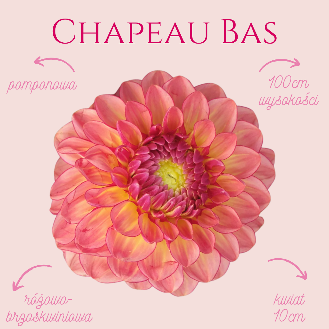 Dalia Chapeau Bas to odmiana pomponowa o wyjątkowo ciepłym, malarskim charakterze. Jej płatki łączą w sobie miękki róż z subtelnymi brzoskwiniowymi tonami, które delikatnie rozjaśniają się ku końcówkom z delikatnie żółtymi środkami płatków. Kwiat jest pełny o klasycznej dekoracyjnej formie i przyciąga uwagę swoją łagodną, romantyczną kolorystyką.