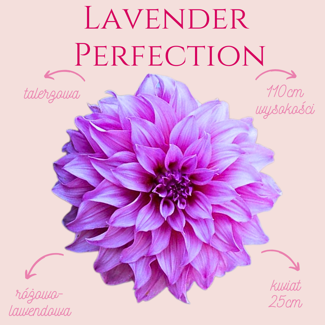 Dalia Lavender Perfection to odmiana talerzowa, która zachwyca dużymi, pełnymi kwiatami w odcieniu różowo-lawendowym. Jej olbrzymie kwiatostany o średnicy 25 cm sprawiają, że jest prawdziwą ozdobą ogrodu. Jest dość wysoka, gdyż dorasta do 110 cm.