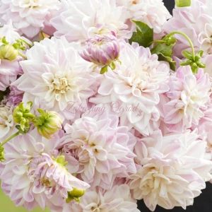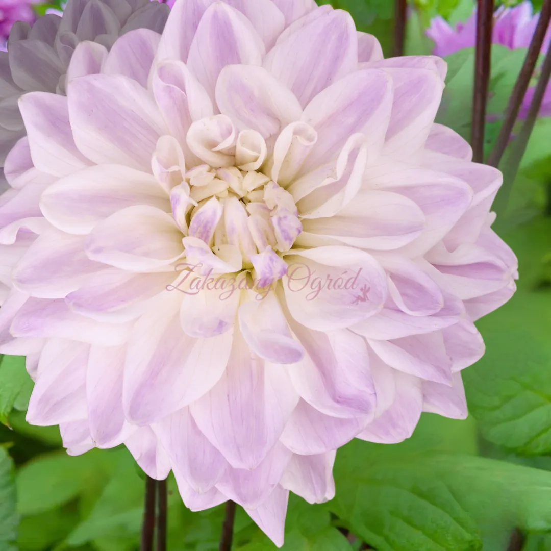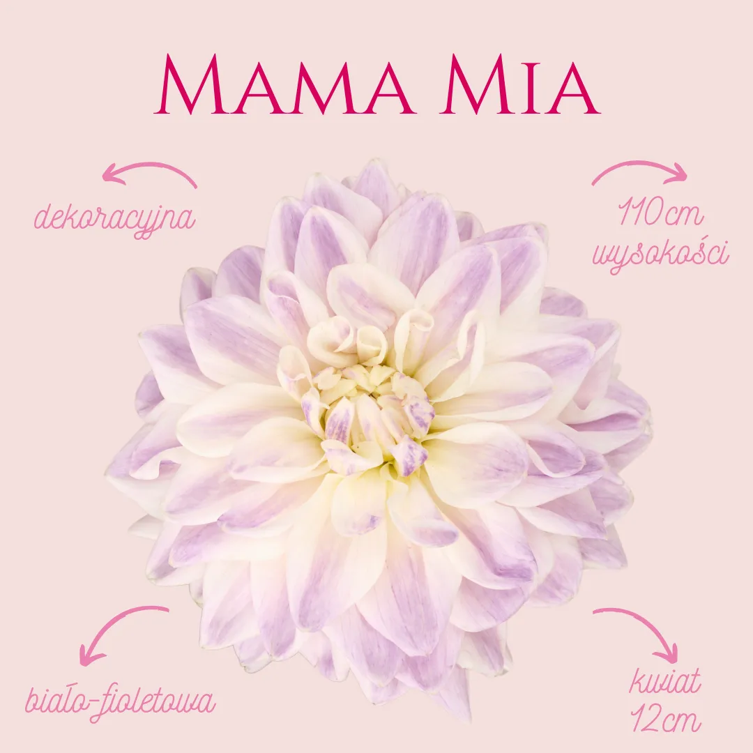 Dalia Mama Mia to niezwykle elegancka i subtelna odmiana, która przyciąga uwagę swoją czystą, jasną kolorystyką. Kwiaty są pełne i regularne, zbudowane z szerokich płatków w odcieniu śmietankowej bieli. Każdy płatek jest delikatnie muśnięty cienkimi, nieregularnymi smugami w kolorze jasnego fioletu lub liliowego różu, co nadaje kwiatom lekkości i wyjątkowego malarskiego charakteru.