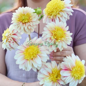 Dalia Polka to urocza i bardzo dekoracyjna odmiana anemonowa o kwiatach w ciepłych odcieniach różu i bieli. Płatki mają delikatne przejścia kolorystyczne - od jaśniejszych, pudrowych tonów ku nieco głębszemu różowi na brzegach. Na środku ma żółty kołnierzyk z pręcików.