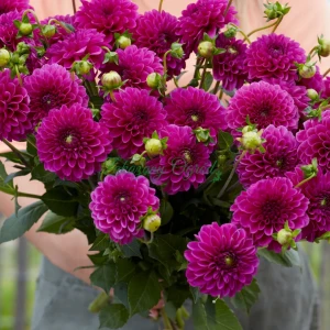 Dalia Purple Fox to wyrazista odmiana pomponowa o idealnie kulistych kwiatach. Jej kolor przyciąga uwagę - nasyconym fioletem, który w zależności od światła i temperatury może przybierać różowawe tony. Płatki tworzą regularną kulę, charakterystyczną dla najlepszych odmian pomponowych.