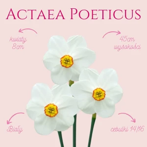 Narcyz - Actaea Poeticus to biały narcyz ogrodowy, który przepięknie pachnie! Przyciąga uwagę przez swoje białe kwiaty i uroczy żółty środeczek z czerwoną obwódką. Jest to wyróżniająca się odmiana, która zdobyła nagrody Award of Garden Merit oraz Wister Award. Nazwa “Narcyz” kojarzona jest z bożkiem, który był zakochany w swoim wyglądzie, a rzeczywista nazwa narcyzów pochodzi od słowa greckiego “narkissos” czyli zasypianie, odurzenie, co wiąże się z intensywnym zapachem tego kwiatu.