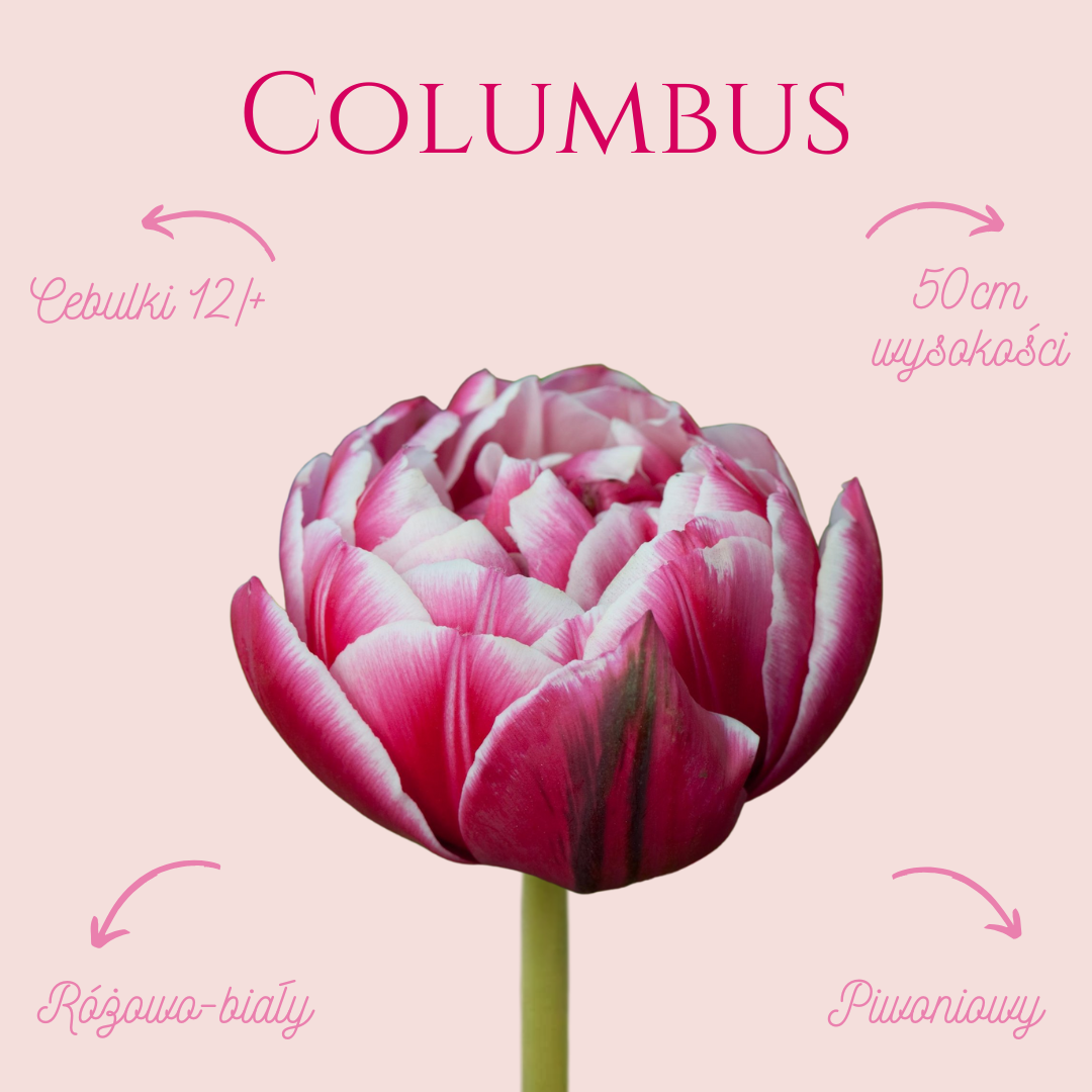 Tulipan - Columbus to odmiana tulipana pełnego o efektownych kwiatach w żywym różowym kolorze z wyraźnym, białym obrzeżeniem płatków. Kwiaty przypominają z wyglądu piwonie, osiągają średnicę ok. 8–10 cm i są osadzone na sztywnych łodygach do maksymalnie 50 cm. Zestaw zawiera 10 cebulek.