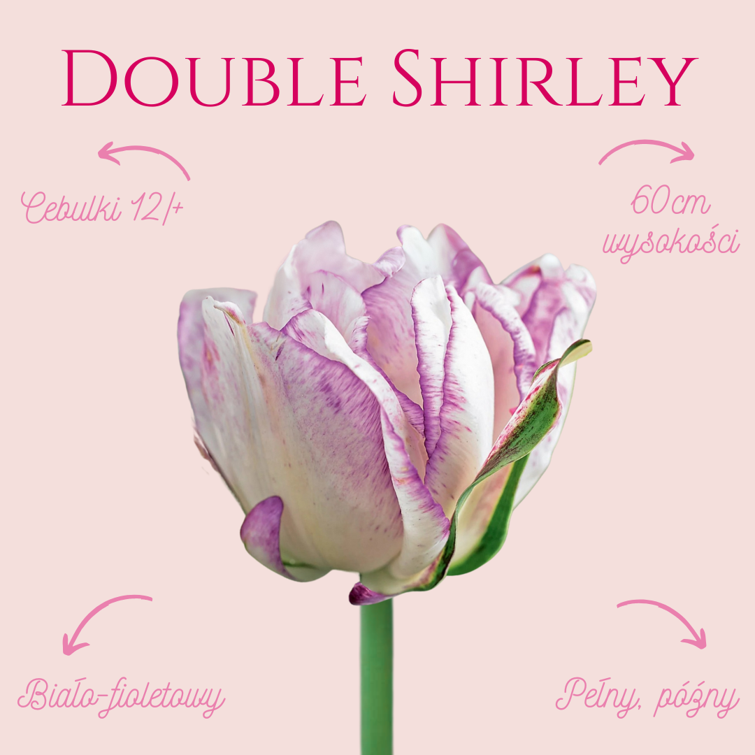 Tulipan - Double Shirley to zjawiskowa odmiana tulipana pełnego późnego. Kwiaty mają jasną, niemal białą bazę i są subtelnie, lecz wyraziście pociągnięte fioletowo-purpurowymi smugami i przebarwieniami przy krawędziach. Z czasem kolor nabiera intensywności. W zestawie znajduje się 10 cebulek.