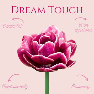 Tulipan - Dream Touch to zjawiskowa odmiana tulipana pełnego o intensywnie purpurowych kwiatach z białą, cienką obwódką na brzegach płatków. Kwiaty przypominają peonie – mają klasyczny kształt i pięknie rozwijają się w miarę kwitnienia. Średnica kwiatów osiąga ok. 10–12 cm. Roślina dorasta do 50-60 cm wysokości. W zestawie znajduje się 10 cebulek.